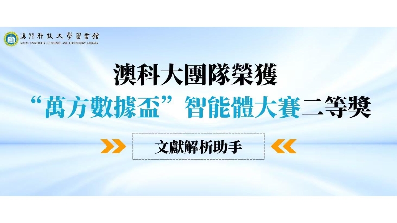 News | MUST Team Wins Second Prize in "Wanfang Data Cup" AI Agent CompetitionA team from Macau University of Science and Technology (MUST) recently achieved second prize in the University Track of the 2025 "Wanfang Data Cup" AI Agent Competition with their project "Literature Analysis Assistant." The team—consisting of Associate Professor U Kin Tak and students Tan Hongqing, Pan Haodong, and Wang Bowen from the Faculty of Innovation Engineering—was the only winning team from Macao.Award-Winning TeamFrom left to right: Wang Bowen, Associate Professor U Kin Tak, Tan Hongqing, Pan HaodongThe "Wanfang Data Cup" AI Agent Competition is guided by authoritative institutions including Science and Technology Daily and the National Steering Committee for MLIS Degree Education, and organized by Beijing Wanfang Data Co., Ltd. Themed "AI Without Boundaries, Intelligent Innovation for the Future," the competition aims to inspire innovation, facilitate academic exchange on AI agent technologies, and promote the development of intelligent technology ecosystems.The competition drew over 2,000 submissions from more than 170 universities, research institutions, and enterprises across 32 provinces, autonomous regions, and municipalities in mainland China, as well as Macao and Hong Kong SAR. After five months of rigorous competition and evaluation, 44 outstanding projects were selected: 1 Grand Prize, 6 First Prizes, 13 Second Prizes, and 24 Third Prizes. The MUST team stood out among numerous entries, fully demonstrating the innovation and application potential of their work.The Winning Project: "Literature Analysis Assistant"—A New Paradigm Empowering Academic ResearchThe MUST team's award-winning project "Literature Analysis Assistant" is an intelligent tool built on Large Language Models (LLM), designed to address a critical challenge in academic research: inefficient literature processing. It provides researchers with efficient, accurate, and visualized analytical support. The core functions of the "Literature Analysis Assistant" include: Intelligent Summarization and Q&ACapable of performing deep analysis of individual papers, generating structured summaries, and providing intelligent answers to user questions. Multi-Document Correlation AnalysisSupports batch processing of multiple papers, conducting cross-comparisons and synthesis, and displaying the intrinsic connections between documents through visualized diagrams. Non-Text Element ParsingIdentifies and interprets non-textual information in literature, including images and formulas.The assistant significantly reduces researchers' workload in literature search, reading, comprehension, and synthesis, thereby improving research efficiency and quality.In 2026, the MUST Library will lead the integration of information literacy and AI education, working with students to broaden horizons and build an intelligent future. Follow our official account to witness more innovations and breakthroughs!·NEWS2026.01.16 -