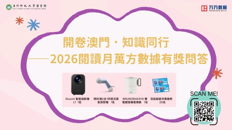 活動 | 開卷澳門.知識同行 ——2026閱讀月萬方數據有獎問答開卷有益,知識同行。你知道嗎?圖書館已為全校師生訂購「萬方數據知識服務平台」—— 一個涵蓋學術論文、期刊、專利、標準等豐富資源的知識寶庫!2026閱讀月特別推出「開卷澳門.知識同行——2026閱讀月萬方數據有獎問答」,只要回答與萬方數據使用相關的題目,即可參加抽獎,有機會贏取精美獎品。快來測試你的檢索功力吧!活動日期:2026年4月15日至2026年5月31日活動對象:澳門九所高等院校師生獎品:Xiaomi智能投影機L1 x 1名飛利浦2合1手提式蒸氣掛熨機x 1名BRUNOBAK810雙電壓便攜電煮鍋 x 1名百佳超級市場禮券 x 20名參加辦法:掃一掃二維碼即可進入答題環節 ↓↓↓注意事項:正確輸入個人資料及聯絡方法確保五條問題全部答對,如未全部答對可重新作答電子資源的使用方法https://lib.must.edu.mo/(可複製粘貼到瀏覽器)點選“資料庫”後,輸入“萬方數據”,再點“搜尋”檢索到“萬方數據知識服務平臺”,在“訪問入口”中點擊鏈接進入登入個人WeMust帳號驗證後即可開啟使用活動時間有限,趕快掃碼挑戰答題贏取豐富的獎品吧~·活動2026.04.14 -