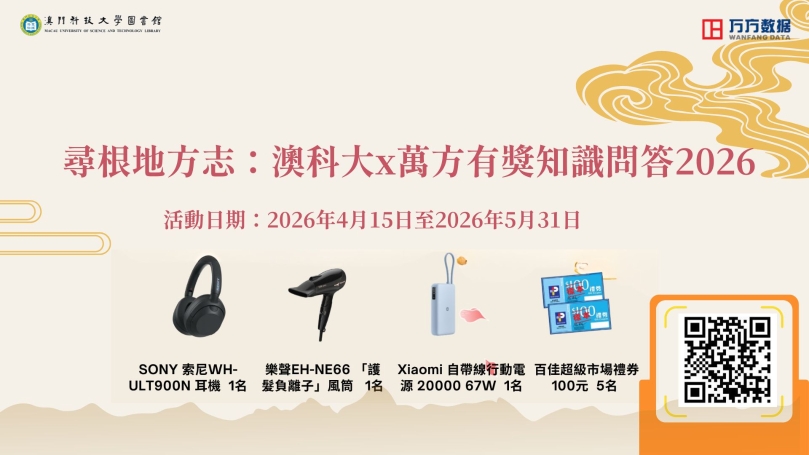 活動 | 尋根地方志:澳科大x萬方有獎知識問答2026為協助師生深入進行區域研究、歷史探索與社會科學分析,圖書館現已訂購「中國地方志數據庫」!此庫收錄了從宋代至民國的舊方志,以及新中國成立後的新編方志,涵蓋全國各省、府、州、縣的志書全文,內容涉及地理沿革、人物傳記、賦稅戶口、學校書院、風俗方言等珍貴史料。無論您是歷史、中文、社會、建築、地理等領域的研究者,都能在此找到豐富的第一手文獻。為進一步鼓勵大家認識這座「地方記憶寶庫」,圖書館與萬方數據合作舉辦「尋根地方志:澳科大x萬方有獎知識問答2026」活動。只要動動手指,從資料庫中尋找答案,就能輕鬆答題贏取好禮!活動日期:2026年4月15日至2026年5月31日活動對象:限澳門科技大學教職員與學生參加獎品:SONY索尼WH-ULT900N耳機x 1名樂聲EH-NE66「護髮負離子」風筒x 1名Xiaomi自帶線行動電源20000 67W x 1名百佳超級市場禮券100元 x 5名參加辦法:掃一掃二維碼即可進入答題環節↓↓↓注意事項:正確輸入個人資料及聯絡方法確保五條問題全部答對,如未全部答對可重新作答電子資源的使用方法https://lib.must.edu.mo/(可複製粘貼到瀏覽器)點選“資料庫”後,輸入“地方志”,再點“搜尋”檢索到“中國地方志數據庫(萬方)”,在“訪問入口”中點擊鏈接進入登入個人WeMust帳號驗證後即可開啟使用活動時間有限,趕快掃碼參與,答對問題就能帶走豐富獎品~·活動2026.04.14 -