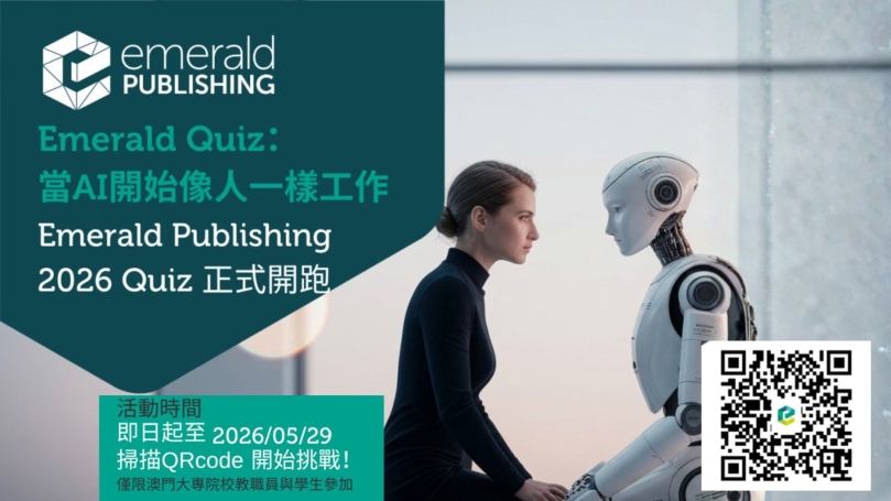 活動 | Emerald 2026年有獎問答圖書館已訂購的Emerald資料庫以商業管理及圖書資訊學之學術期刊為核心,涵蓋會計金融、人力資源、市場行銷、旅遊管理、教育管理、機械工程、材料工程等學科,此庫可協助您更容易取得全文及查找權威期刊。為進一步鼓勵師生積極探索這個資源,圖書館現正舉辦「Emerald 2026年有獎問答」活動。本次活動設計了一個有趣的五分鐘挑戰,主題為「AI 會搶走你的工作嗎?」。活動期間,讀者只要登入Emerald資料庫進行檢索並完成所有題目,即有機會獲得豐富獎品,歡迎全校師生踴躍參加!活動期間:由即日起至2026年5月29日獎品:一奬:irocks K71R鍵盤x 1名二獎:Nordace經典暢銷後背包x 2名三獎:小米電動沖牙器F300 x 2名參加辦法:掃一掃二維碼即可進入答題環節 ↓↓↓注意事項:請確保裝置連線於校園網域內,否則可能無法點閱文章。每人每日限填一次,以「姓名+Email」為判斷依據,重複作答不予計算。本活動開放澳門各大專校院在校學生及現任教職員參加。中獎者若於通知發出後10個工作天內未回覆,視同放棄,將另行抽選遞補。電子資源的使用方法https://lib.must.edu.mo/(可複製粘貼到瀏覽器)點選“資料庫”後,輸入“Emerald”,再點“搜尋”檢索到“Emerald eJournals and ebooks”資料庫,在“訪問入口”中點擊鏈接進入登入個人WeMust帳號驗證後即可開啟使用活動時間有限,趕快掃碼參與,掌握資料庫技巧同時贏取豐富的獎品吧~·活動2026.04.14 -